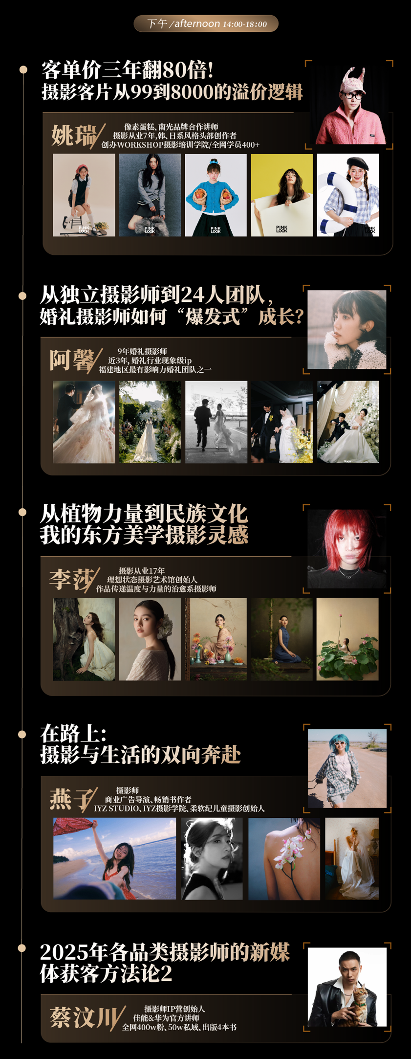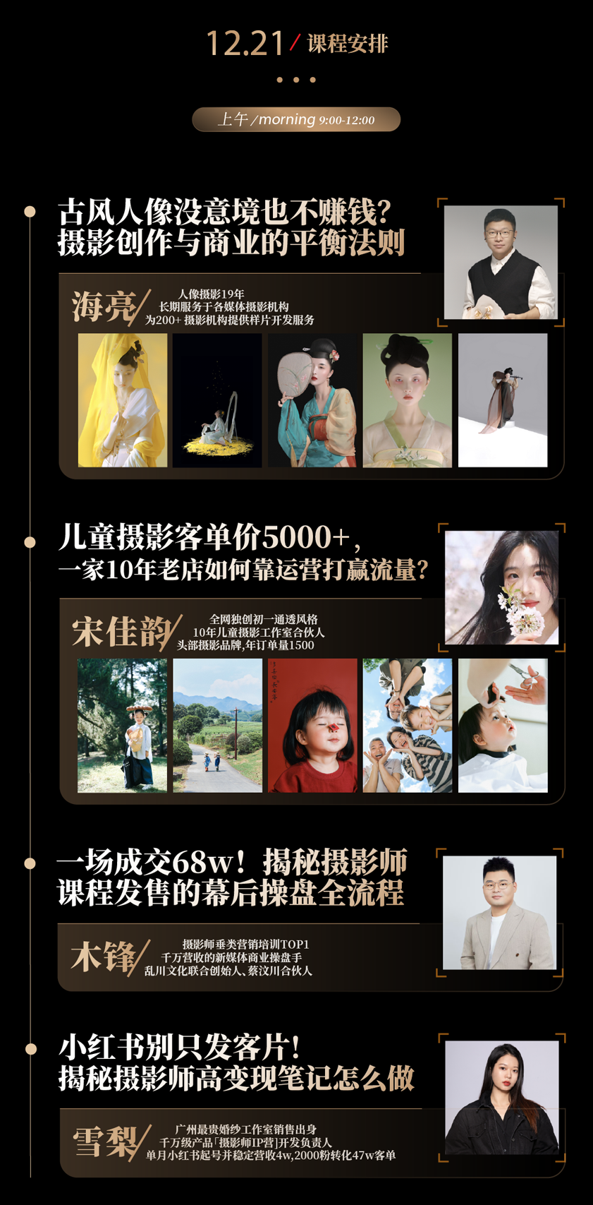 十多位依然闯过这些难关的照相师,亲临现场。从个东说念主写照、亲子拍照,到交易拍摄简直涵盖了交易照相的各个限度。每位齐带真实打实的实战造就,把踩过的坑、趟出的路,全拆成你能径直用的想路!